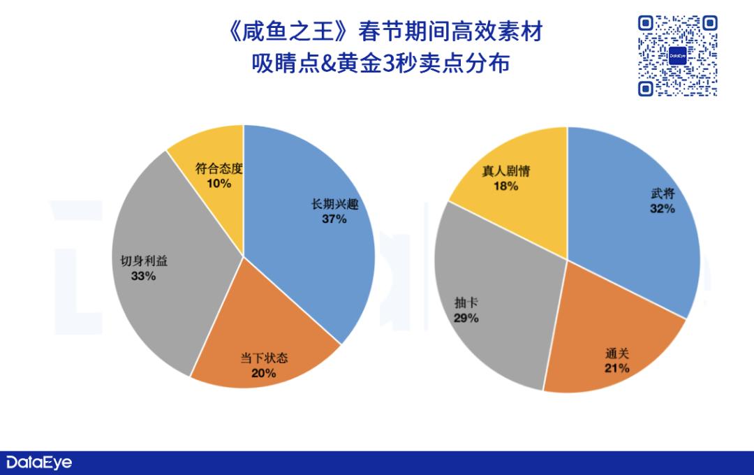 具体在素材创意方面。《咸鱼之王》TOP20高效素材在吸睛点上,主要通过三国题材进行切入,吸引更多三国核心及爱好者玩家和潜在用户的关注和提高兴趣。