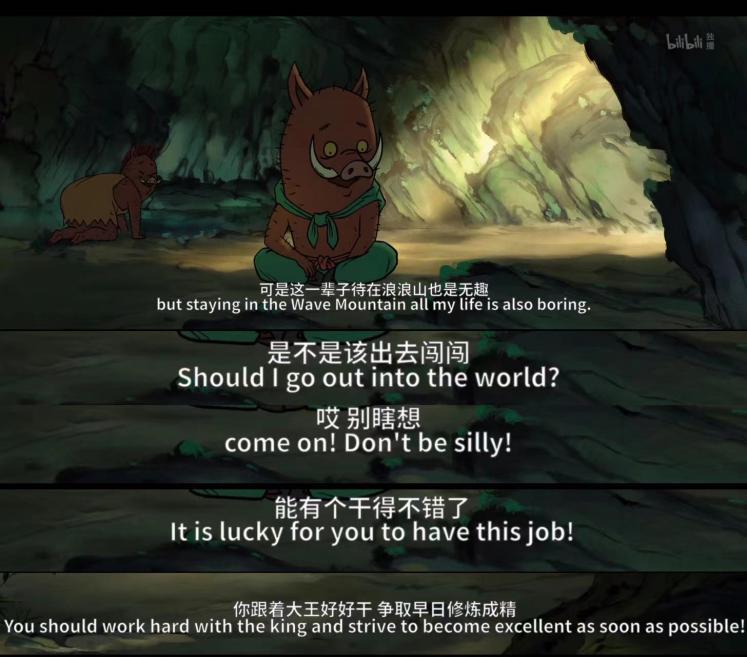 在B站,第一集里出现最多的弹幕之一是“家里顶梁柱,社会边角料”。家内与外部世界的经验并不互通,在小猪妖的妈妈眼里,儿子是祖宗三代出的唯一人才。她无法得知更多情况,只能告诉儿子多喝水,以及“早日跟着领导好好修炼成精”。