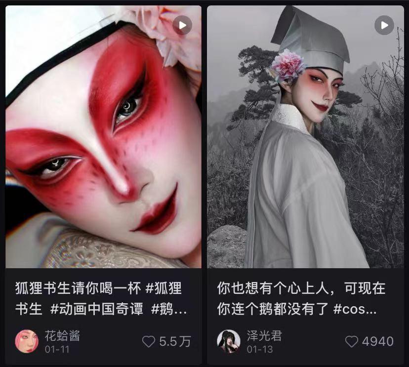 小红书上的狐妖仿妆。来源:小红书用户@花蛤酱、@泽光君