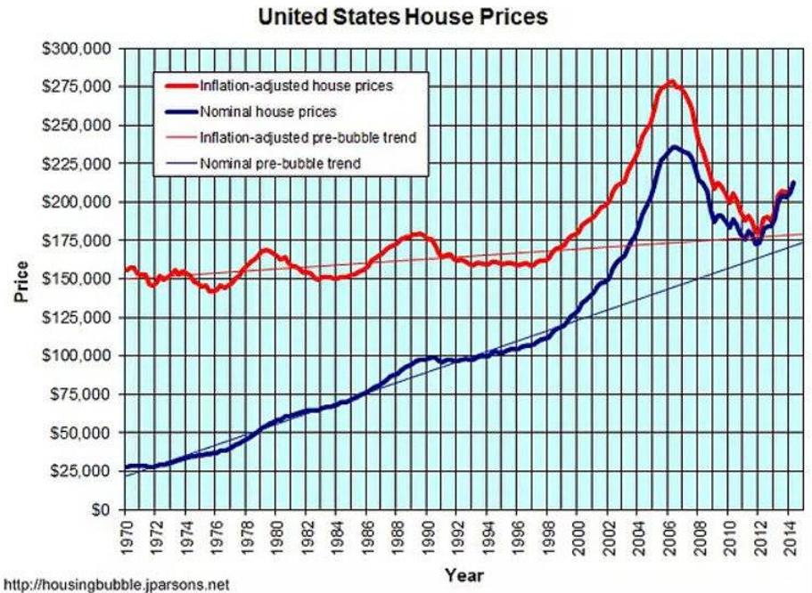 他们发现,剔除通胀后的房价,走势很有规律、很稳健:从1975年到2000年,年均涨幅只有1.4%左右。
