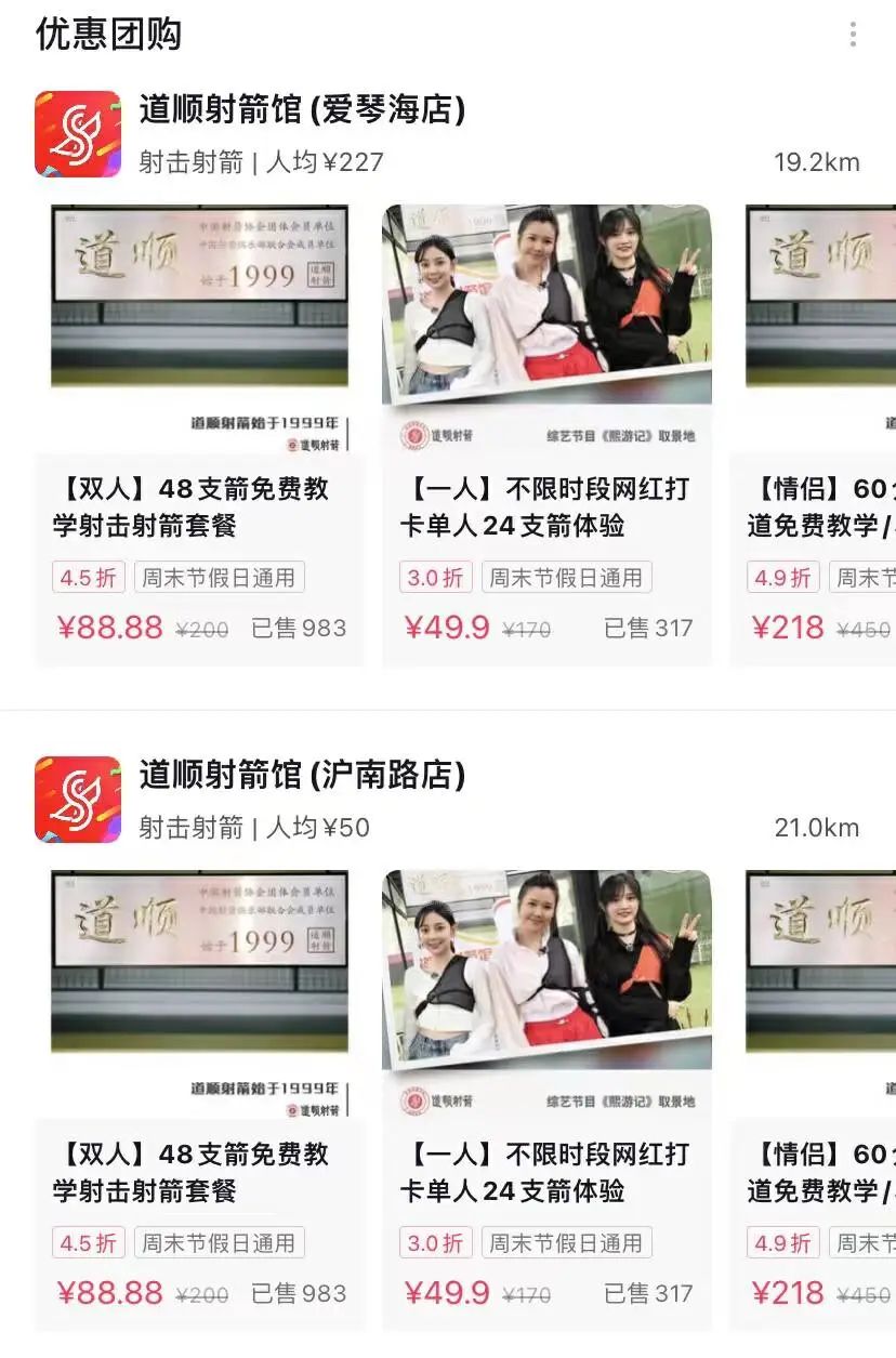 像道顺射箭馆是全国最大的连锁射箭馆,本身知名度就较高。在大众点评等其他平台上搜索“上海射箭”,就能看到道顺射箭馆处于靠前的位置。而邓威曾任职的拜博口腔、马泷齿科,也都是较知名的口腔机构。