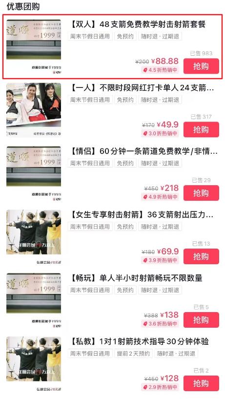 道顺射箭馆的抖音团购价格相比市面上其他射箭馆较为优惠,像“ 88.88 元双人射箭”是店里的热销套餐。而龙海涛做留存的方法,就是将引来的抖音用户导入私域中,逐步增加用户粘性。