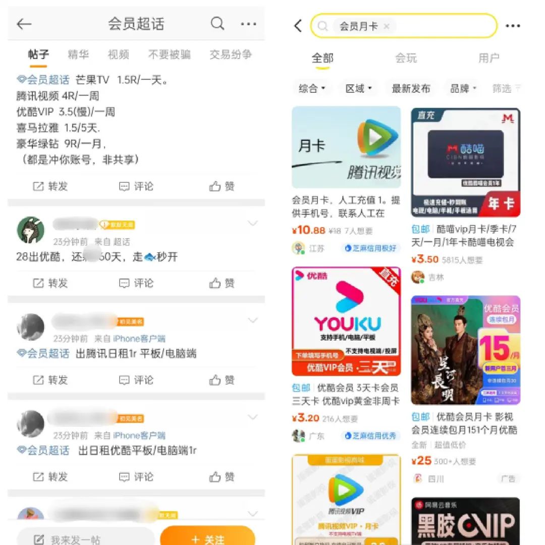 事实上,平台想要抵制的“视频会员倒卖”现象,一直以来普遍存在着。黑灰产们在淘宝、闲鱼、双微等社交平台上,以低价售卖日卡、周卡、月卡。家人、朋友,甚至陌生用户之间也存在着相互交易,例如在“会员”超话中,不断有人发微博出会员权益、拼会员权益,价格低至一个腾讯平板会员只需要6元/月,是正价的1/4。