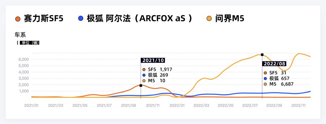 其中,问界 M5 的基础车型赛力斯 SF5,在变身问界以前的 2021 年,全年一共也只卖出了 6000 台。