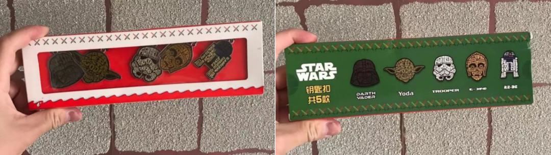 比如《星球大战》推出的一款钥匙扣,就不仅是简单的描线加填色,而是用不同的文字符号填充在了人物形象的轮廓中,通过精心的再设计让产品拥有IP精神内核的差异化,从而获得用户对其溢价的认可。