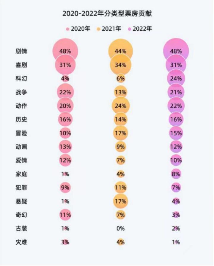 比起脱离内容属性的IP,基于影视内容而存在的IP始终面临着生命周期短的问题,极少有好莱坞那样的长线IP出现。并且,适合衍生品开发的科幻、玄幻、动画等电影类型,在国内电影市场一直也并非主流。据灯塔研究院《2022年中国电影市场年度盘点报告》,在疫情三年的分类型票房贡献中,占据主要位置的还是剧情、喜剧、战争、动作等类型。这类影片并不是完全不能做IP授权,而是可尝试的范畴和想象力相对有限。
