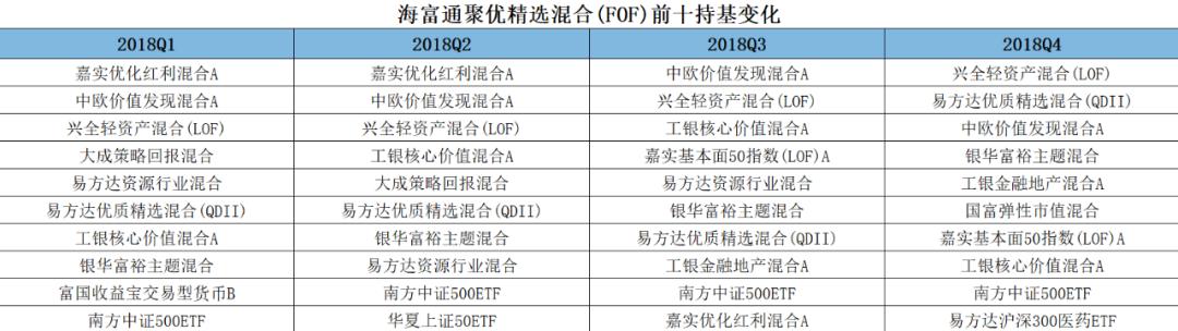 作为首批公募FOF中唯一一只以权益基金投资为主的产品,“海富通聚优精选混合(FOF)”持有的绝大部分都是前一年市场中大红大紫的明星基金,例如“嘉实优化红利混合A”、“中欧价值发现混合A”、“兴全轻资产混合(LOF)”等,而这样的选基方法实际上与普通基民无异。