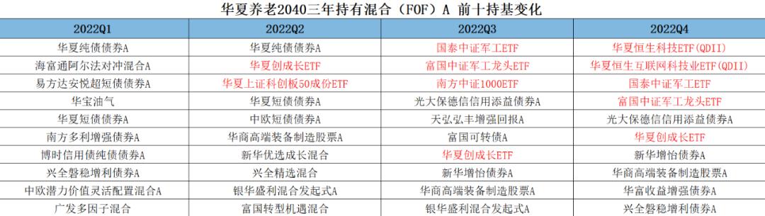 比如,许利明所管理的“华夏养老2040三年持有混合(FOF)A”。在过去的一年中,ETF持仓呈现出逐季递增的趋势。到2022年四季度时,ETF在其前十持基中占了一半。