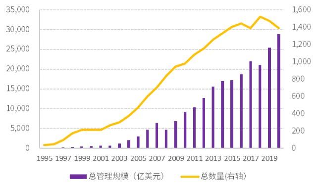 20世纪90年代,美国股市开始了连续10年的繁荣,公募行业趁势发展壮大也为FOF的稳定发展提供了丰沃的土壤。进入新世纪后,美国公募FOF进入快速增长期。截至2021年末,美国公募FOF存续数量超过1400只,合计规模超过3万亿美元。