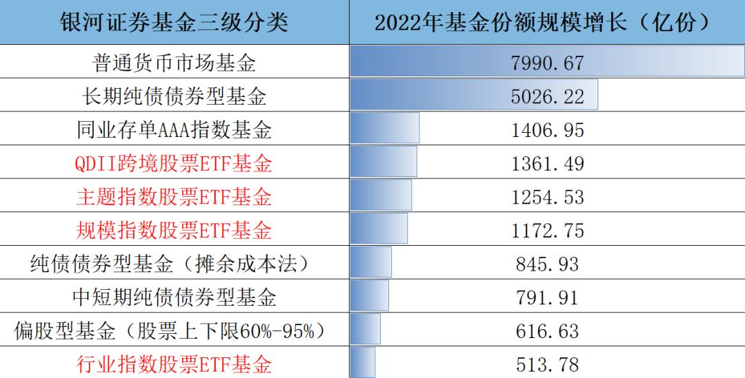 根据银河证券基金研究中心数据显示,在2022年基金份额规模增长前十排名中,ETF占据了4席。