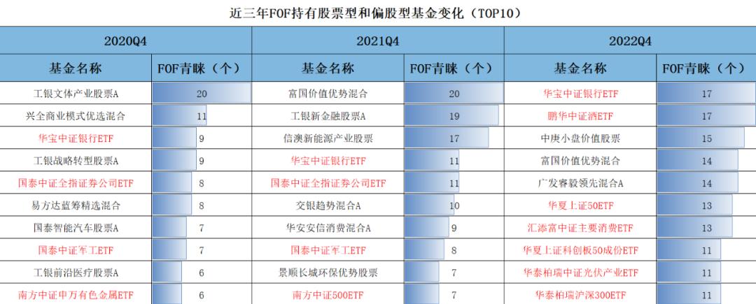 从过去三年间基金披露的四季报情况来看,最受FOF青睐的股票型和偏股型基金的数量,已从2020年的4只增加至2022年的7只。