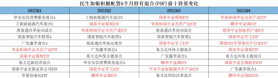 民生加银基金资产配置部总监苏辛,对于ETF更是偏爱。在他所管理的“民生加银积极配置6个月持有混合(FOF)”前十持基中,到2022年四季度时,ETF更是多达8只。