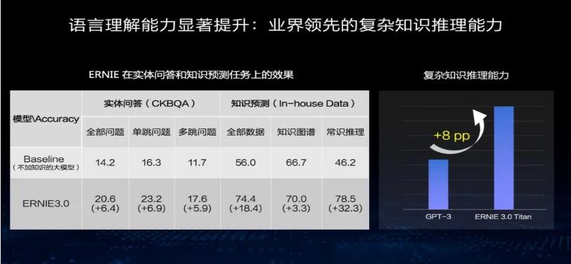 百度宣称“文心大模型”是产业级知识增强大模型”,其发布的全球首个知识增强的千亿大模型,拥有2600亿的参数,在60多项的NLP任务上取得了世界领先。在复杂知识推理能力上,相比GPT-3,文心ERNIE在复杂知识推理能力上有8个百分点的绝对提升。