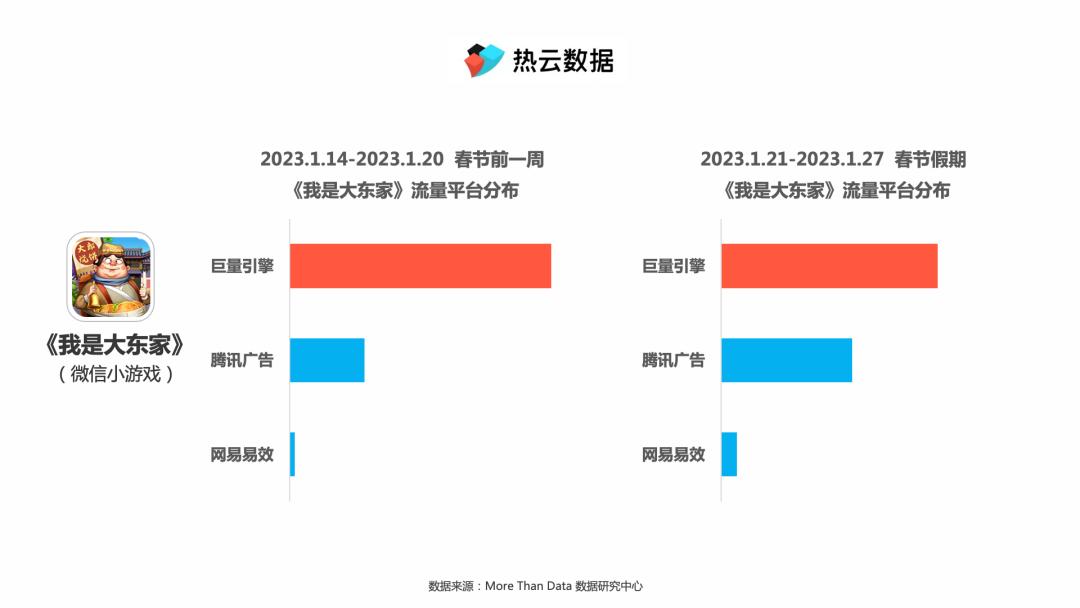 今年春节档买量的另一个趋势,则是微信小游戏的崛起,累计超过2200个微信小游戏进行了买量投放。《我是大东家》、《咸鱼之王》等四款微信小游戏的投放量级较大,进入买量榜Top 30。其中,《我是大东家》更是力压《一念逍遥》、《超能英雄》等常年雄踞榜单前十的买量大户,登顶买量榜第一。