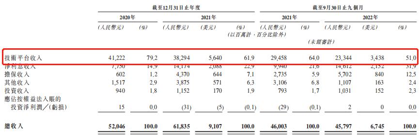 市界还发现,原来作为营收支柱的技术平台(可简单理解为放贷服务费和理财服务费)收入比例由2020年的79.2%,降至2022年前9个月的51.0%。
