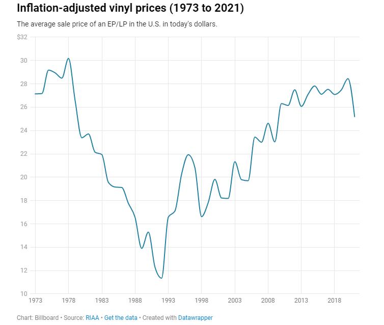 在1978年之后,黑胶唱片的零售价格便开始下跌,这对黑胶唱片发烧友来说是一个坏消息。不过,由于新冠疫情相关的供应链问题导致投入价格和运输费用大幅上涨,EP/LP的平均销售价格可能会在2022年上涨。