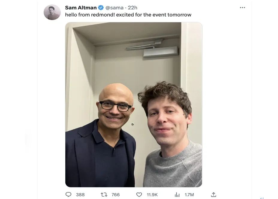 当昨天谷歌正在如火如荼地发布着自家的AI计划之时,OpenAI的创始人Sam Altman也在推特上发了一张自己与微软总裁纳德拉的合照,并配文表示期待“明天的活动。”