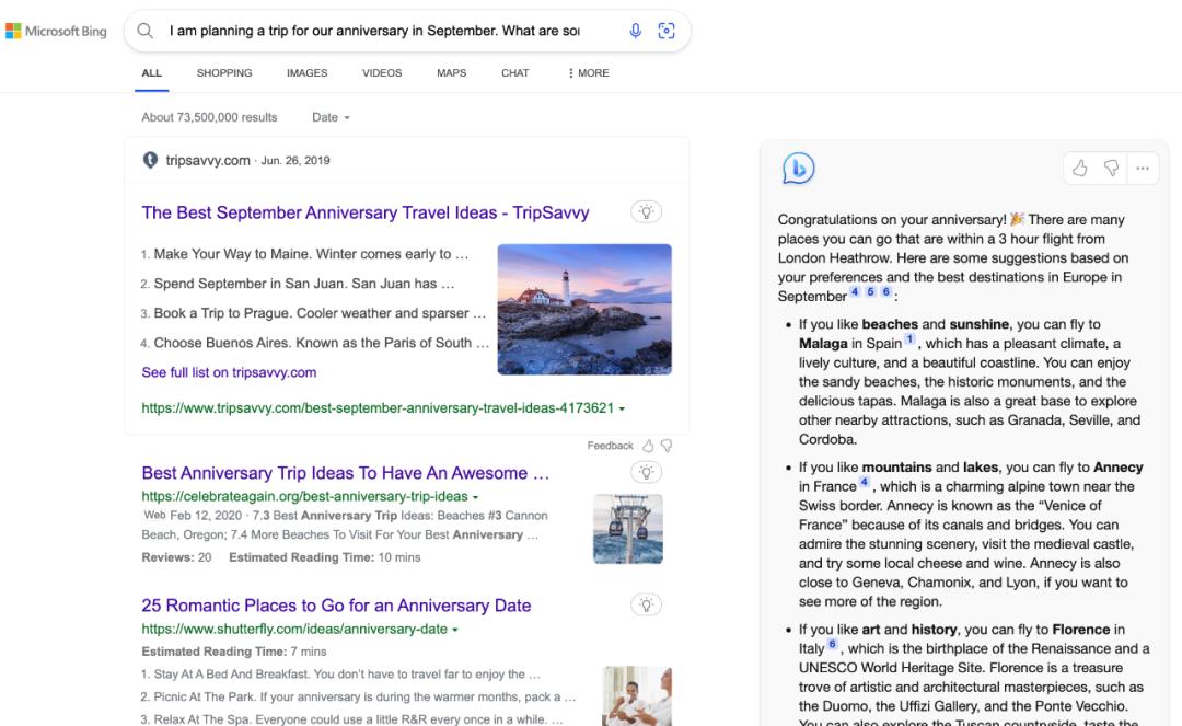 今天,集成了 ChatGPT的新版Bing搜索引擎正式闪亮登场。新版Bing带有一个扩展的聊天框,它现在可以做的不仅仅是回答事实问题和为你提供各种链接,在ChatGPT的帮助下,它还能够为你即时生成各种个性化的规划、建议、分析等,解决更复杂的搜索问题。