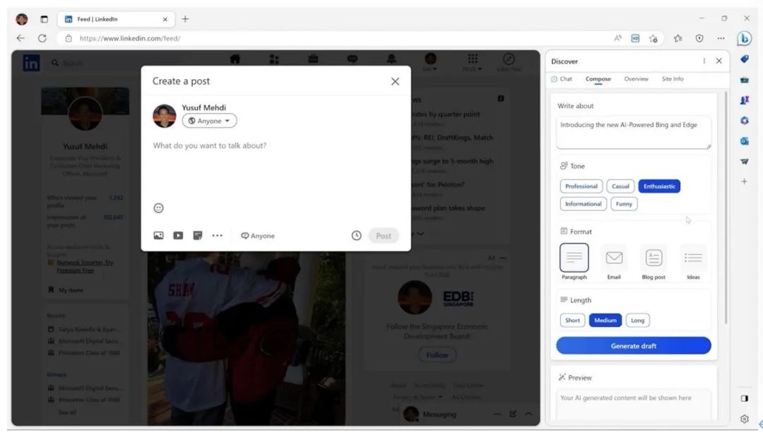 此外,在内容生成方面上,它将大大解放创作者的双手。比如当你想在LinkedIn、Twitter、Facebook等平台发布帖子,你可以直接在 Edge浏览器中调用对话框让AI帮助撰写内容, 同时 你还能规定它所生成内容的语调、格式和长度。