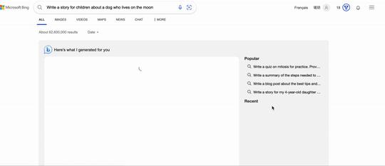 在新版Bing上,目前 用户可以输入最多 1 000 个单词的查询问题,AI生成的回复 将 与来自网络的常规搜索结果一起出现。