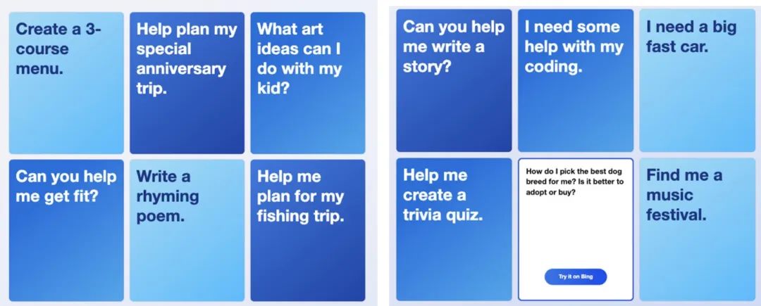 在Bing给出的示例中,内容涉及做计划方案、写诗和故事、写代码、做菜单、给买车建议等等,几乎囊括了人们日常生活中的方方面面。