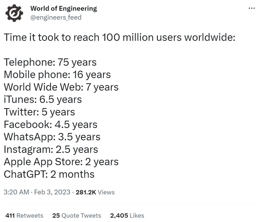 也因此在2月初,仅仅正式上线了2个月的ChatGPT超过Tiktok,成为互联网历史上最快突破1亿月活的应用。为了达成这个小目标,年轻的Tiktok用了9个月,再之前的App Store花了两年时间。
