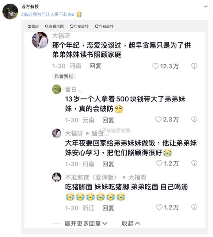 有网友如是说:“共情高启强不是因为他是黑社会,而是因为大多数人有着和他一样的出身,都经历着他曾经历过的苦楚。观众在旁观高启强的人生时,发现这位黑社会老大曾经也足够普通,甚至是不如普通人的最底层民众。13岁,拿着500块钱养大了弟弟妹妹,大年夜在派出所时,只想着回家给弟弟妹妹做饭。高启强最初的人设,充满着温情、善良,的确令人恨不起来。”