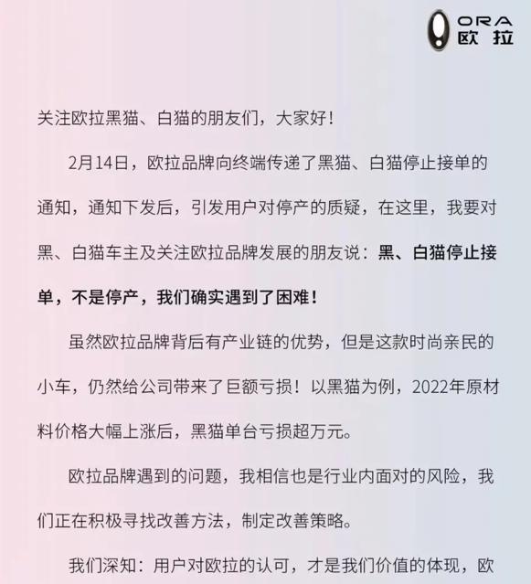 2022年2月,长城不再接收黑猫、白猫车型的订单,对此,欧拉品牌CEO董玉东表示,“虽然欧拉品牌背后有产业链的优势,但是这款小车仍然给公司带来了巨额亏损,以黑猫为例,2022年原材料价格大幅上涨后,黑猫单台亏损超万元。”