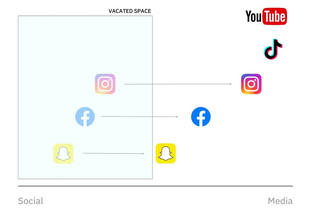Facebook、Instagram、YouTube 和 Snapchat 都推出了相应的功能,以留存用户的注意力。如果你把社交媒体看作一个光谱,那么,从社交到媒体,所有这些公司都在向后端转移。
