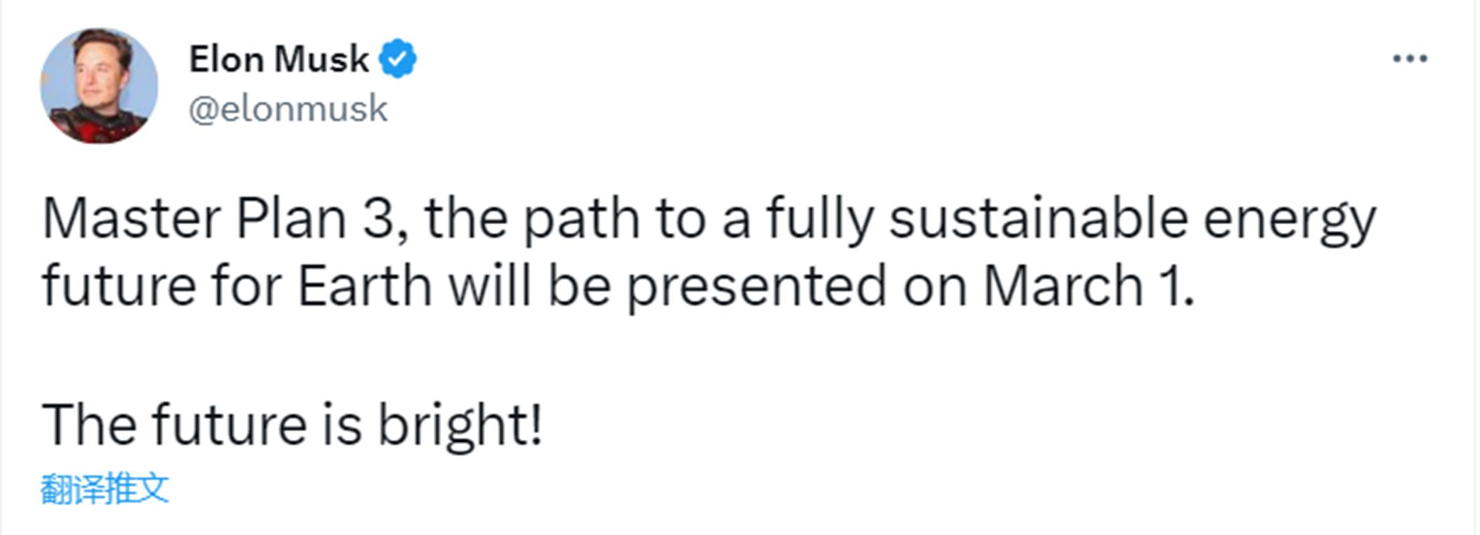 今日,马斯克发文宣布,将于3月1日(投资者日)推出特斯拉宏图第三篇章(Master Plan Part 3),这将是一条通向“完全可再生能源未来”之路,前路一片光明。