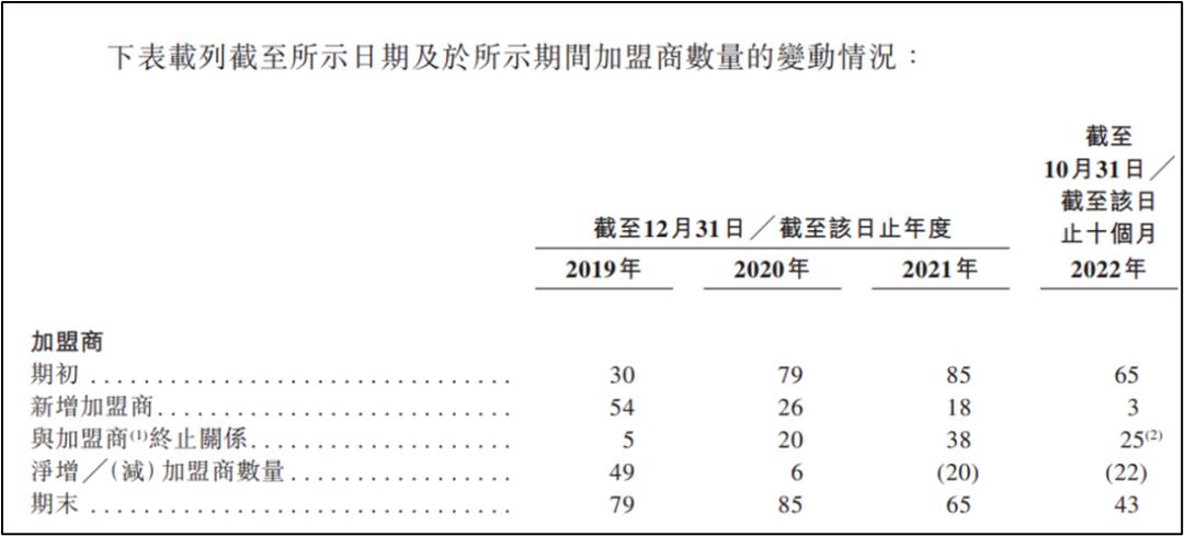 具体来看,2019年、2020年、2021年和2022年前十个月,KK集团新增加盟商数量分别为54家、26家、18家和3家;同期,与加盟商终止合作的数量分别是5家、20家、38家和25家。