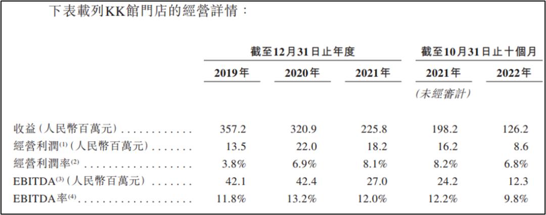 从经营情况看,KK馆处于不断收缩状态。KK馆营收从2021年的3.57亿元一路下降至2022年前十个月的1.26亿元;经营利润则从2019年的1350万元下降至2022年前十个月的860万元。从经营效率看,经营利润率从2019年的3.8%提高至2022年的6.8%,但EBITDA率则从2019年的11.8%降至2022年前十个月的9.8%。