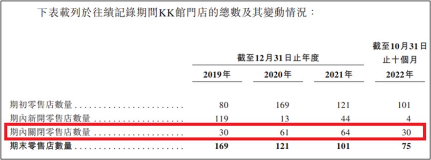 加盟商加速出逃,直接原因是门店经营业绩拉跨,加盟商盈利困难。招股书显示,KK集团占比80%的自有门店2022年前十个月的销售额仅占总销售额的63.8%,占比20%的加盟店销售额占总销售额的比例为27.2%。由此可见,KK集团自有门店的经营业绩效率也不高,很难让加盟商看到希望。