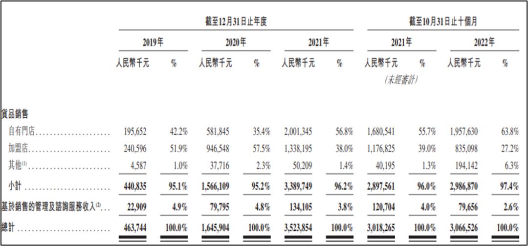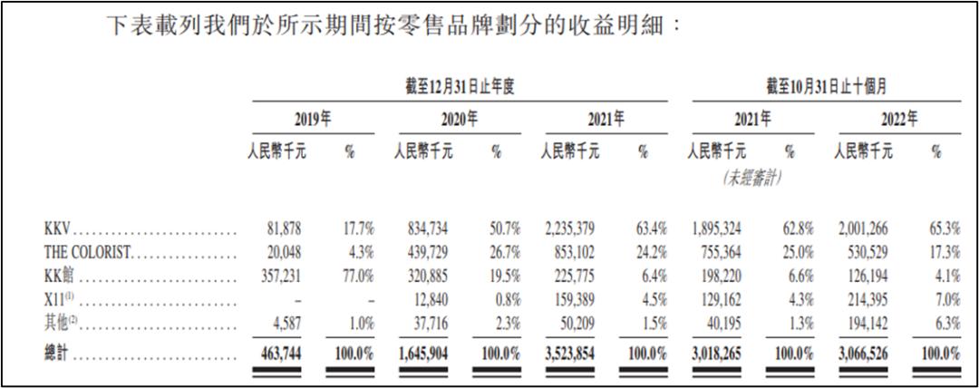 截至2019年、2020年、2021年及2022年10月31日,源自KKV门店的收入分别为8190万元、8.35亿元、22.35亿元及20.01亿元,分别占同期总收入的17.7%、50.7%、63.4%及65.3%。