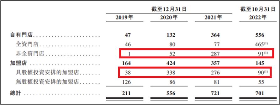 截至2022年10月末,KK集团加盟店仅剩下145家,其中只有55家是加盟商全资运营的,另外90家是KK集团与加盟商的合作店,按50%持股计算,实际加盟商自营店只能算45家。因此,KK集团701家门店里,大约只有100家属于加盟商的,其余600家都是KK的全资自营店。