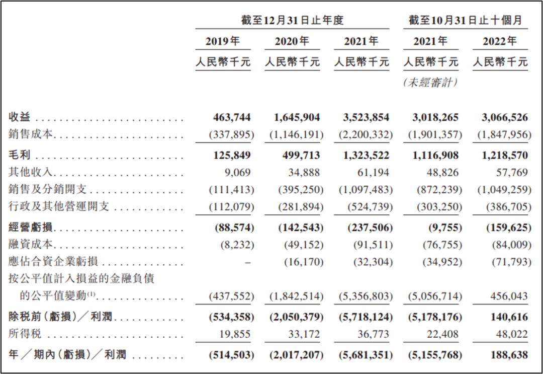 招股书显示,KK集团的收入主要来源于两部分:1)自有门店零售销售及向加盟店销售;2)基于销售的管理及咨询服务收入,如门店管理费、物流费用及向加盟商收取的POS费用。2019年、2020年、2021年以及截至2022年前十个月,KK集团的收入分别为4.64亿元、16.46亿元、35.24亿元、30.67亿元,净利润分别为-5.15亿元、-20.17亿元、-56.81亿元、1.89亿元,不到四年的时间累计亏损高达82.13亿元。