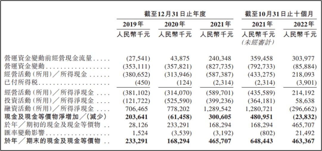 招股书显示,截至2019年、2020年、2021年及2022年10月31日,KK集团的现金和现金等价物分别为2.33亿元、1.68亿元、4.66亿元、4.63亿元。按照过往几年的经营现金净流出速度,KK集团的现金只能维持不到一年。这也意味着,不能迅速上市融资续命的话,KK集团将面临资金链断裂的风险。