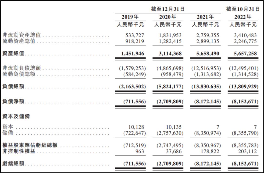 此外,KK集团的资产负债表正在迅速恶化。2019年、2020年、2021年以及截至2022年前十个月,KK集团的负债净额分别为人民币7.12亿元、27.10亿元、81.72亿元元及81.53亿元。