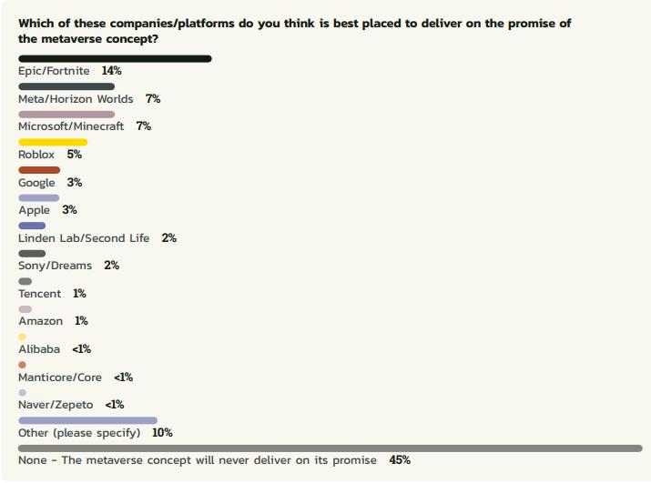 对于未来的元宇宙市场,有14%开发者看好Epic Games,有7%看好Meta,7%看好微软,5%看好Roblox,3%看好谷歌,甚至有部分开发者看好VRChat、NVIDIA。当然,45%并不看好元宇宙,几乎占半数。值得注意的是,开发者对元宇宙的态度似乎比去年更消极、谨慎(去年只有33%不看好元宇宙)。