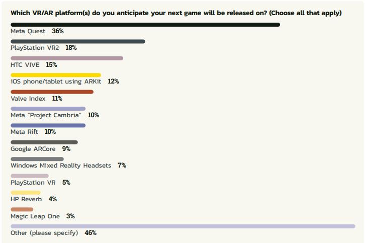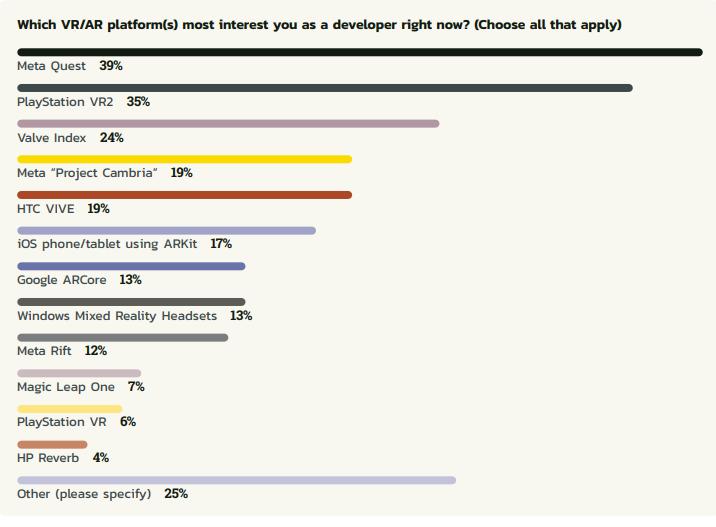 另一个明显的趋势,Quest依然是开发者首选的VR平台,并且获得越来越多开发者关注,去年为Quest开发游戏的只有27%,而今年39%开发者表示对其感兴趣。