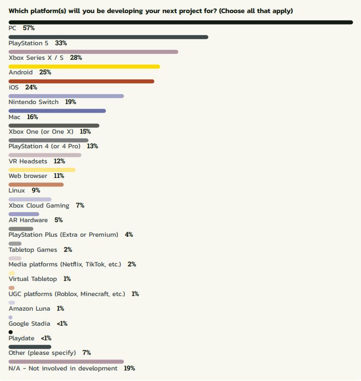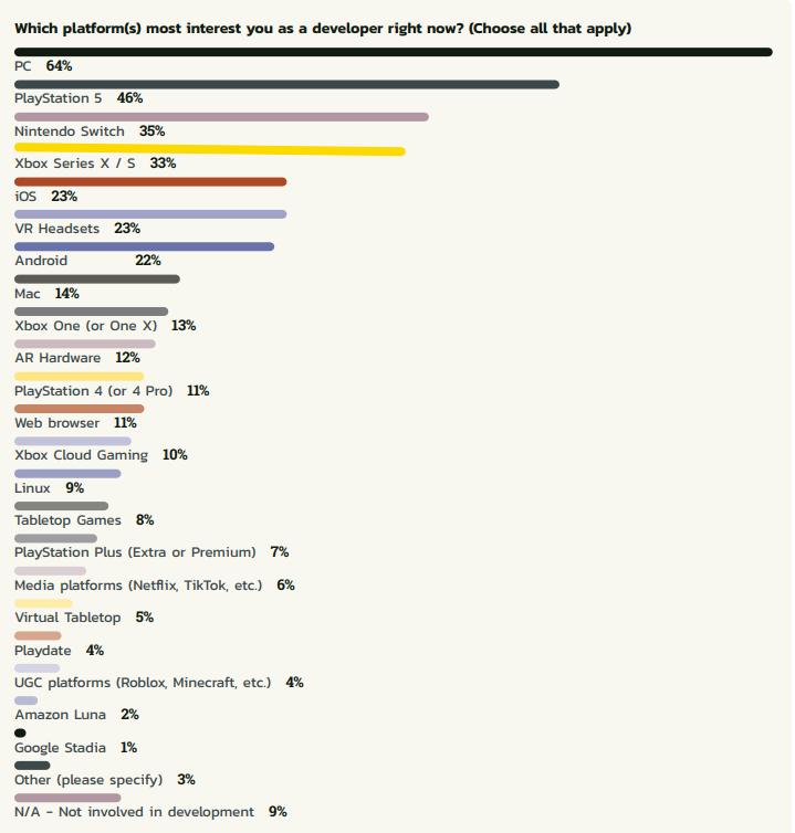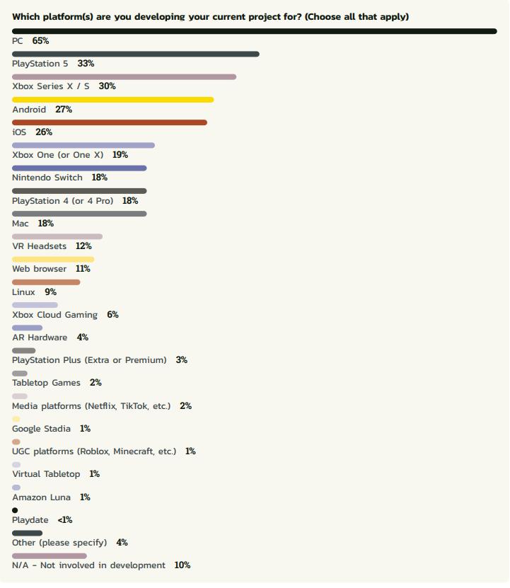 ◎ 12%受访者在为VR平台开发游戏,仅次于Mac;