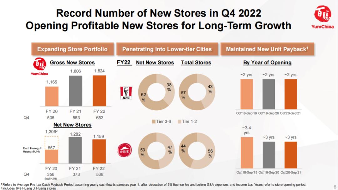 截至2022年12月31日,公司门店总数达到12947家,全年净新增1159家门店,改造了469家门店。回顾公司2022年目标为净新增约1000至1200家门店,较好实现财年目标。具体来看,2022年第一季度公司净新增329家门店,第二季度净新增53家门店,第三季度净新增239家门店,第四季度净新增538家门店。可以看到,第二季度受疫情影响最大,第三季度逐渐恢复开店步伐,集中在第四季度开店以追赶年度目标,净新增门店数也在该季度创下历史新高,同时保持健康的新店回报率。