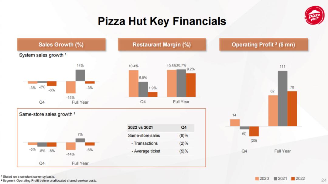 而必胜客营收19.60亿美元,同比下跌7%,同店销售额下跌6%,餐厅经营利润同比下跌36%,餐厅利润率同比下跌1.5%。
