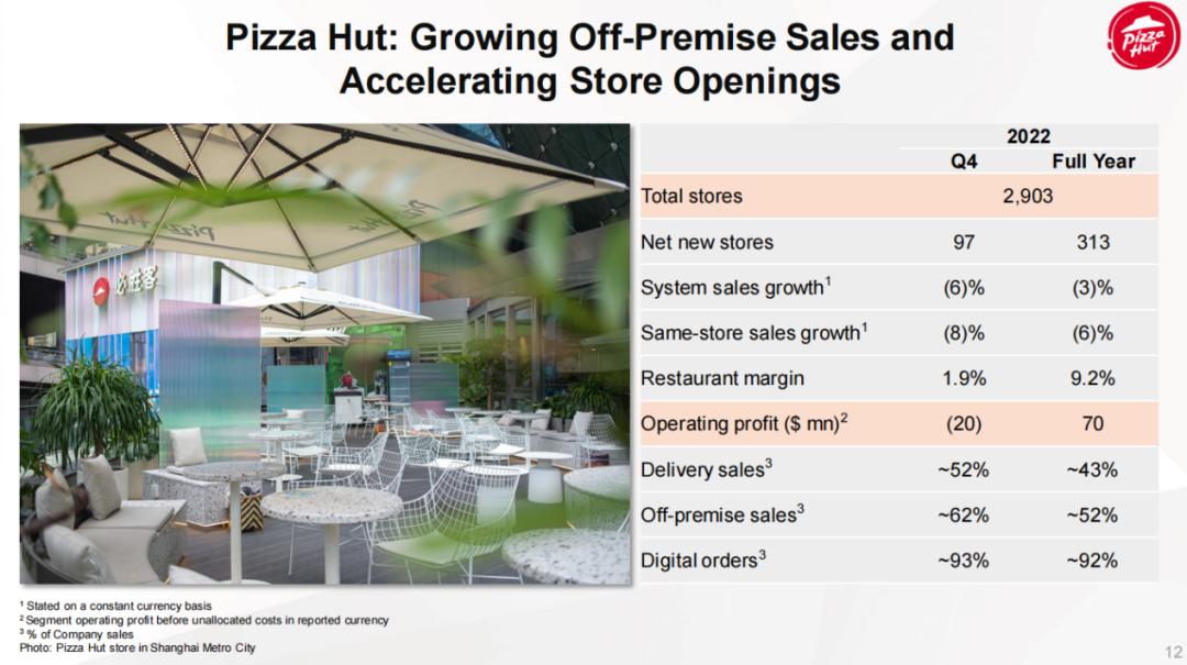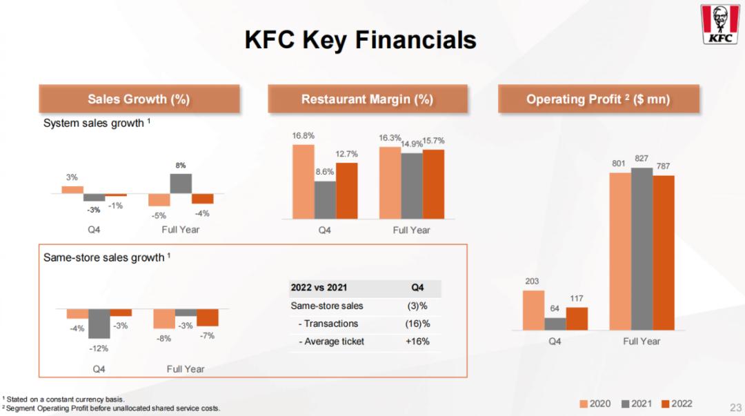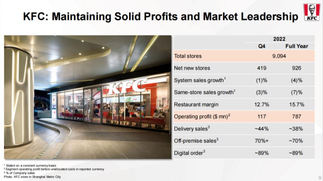 2022年第四季度同店销售额同比下降4%,其中肯德基和必胜客分别下降3%和8%。公司全年同店销售额同比下降7%,其中肯德基和必胜客分别下降7%和6%。2022年第四季度餐厅利润率为10.4%,去年同期的餐厅利润率为7.5%。2022年全年餐厅利润率为14.1%,去年同期为13.7%。主要变动原因是生产力提高、运营效率及临时补贴,部分被同店销售下降,包括门店暂时停业,外卖订单增长带来的骑手成本增加以及原材料和工资成本上涨所抵消。