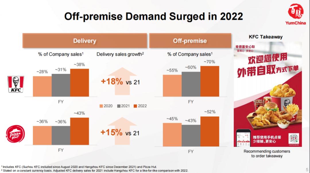 数字化及外卖方面,肯德基和必胜客的会员计划合计超过4.1亿。2022年疫情严重影响了堂食客流,外卖需求强劲。去年第四季度,会员销售额约占销售额的60%,外卖收入约占两大品牌收入的45%,较去年同期增长10%,数字订单(包括外卖订单、手机下单及自助点餐机订单)约占两大品牌收入的90%。
