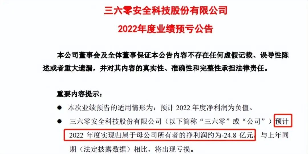 2022年,三六零的业绩进一步恶化。业绩预亏公告显示,该公司预计去年归属净利润亏损24.8亿元。