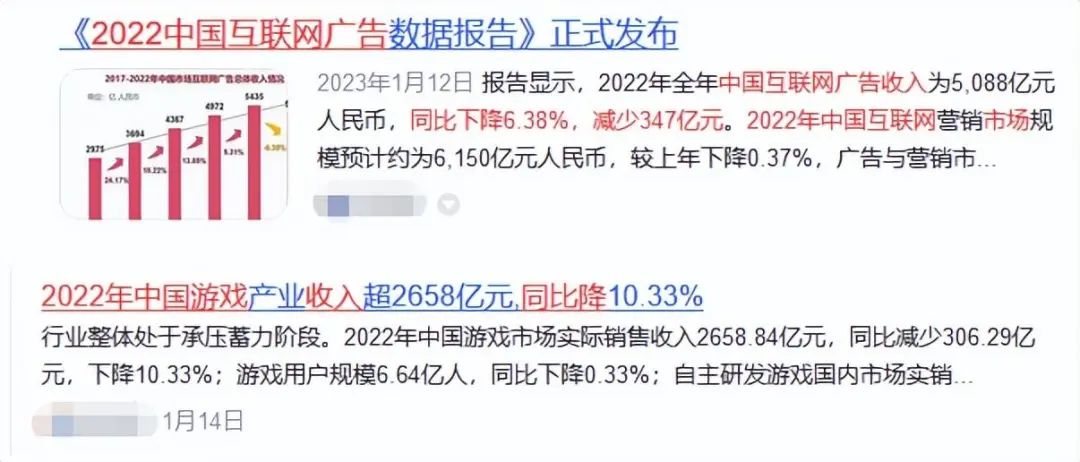 一组数据显示,2022年,国内互联网广告收入为5088亿元,同比下降6.38%;同期,国内游戏市场实际销售收入为2658.84亿元,同比下降10.33%。