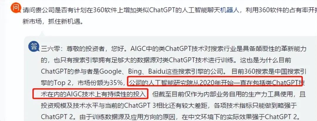 在今年2月2日,有股民在互动易上提问道,“请问贵公司是否有计划在360软件上增加类似ChatGPT的人工智能聊天机器人,利用360软件的占有率开拓新市场,抓住新机遇。”