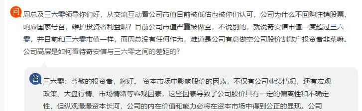 三六零回复称,“资本市场中影响股价的因素,不仅有公司业绩情况,还有宏观政策、大盘行情、市场情绪等客观因素,这些因素导致了公司股价具有一定的偏离性和不确定性,但纵观漫漫资本长河,公司的内在价值和能力必将在资本市场中得到公正的显现。”