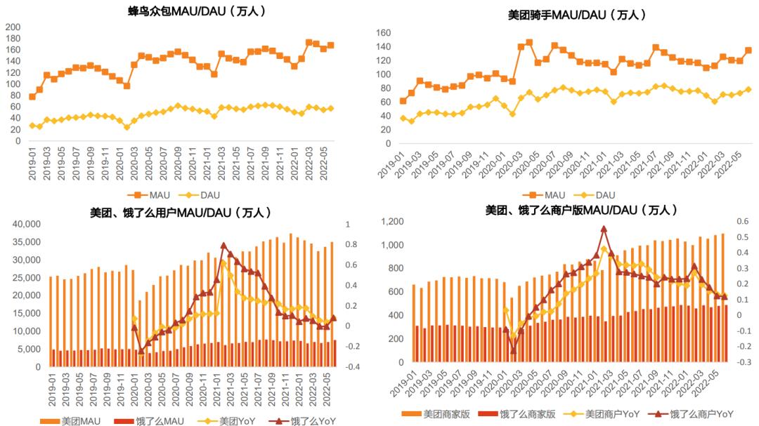 QuestMobile统计的数据显示,自2019年以来美团APP的MAU整体呈上升趋势,截止去年三季度的年度交易用户数逼近7亿大关,是老对手饿了么的6倍。此外,美团商家版、美团骑手等相关APP的月活数据也大幅领先,骑手、商家资源都相当丰富且稳定。